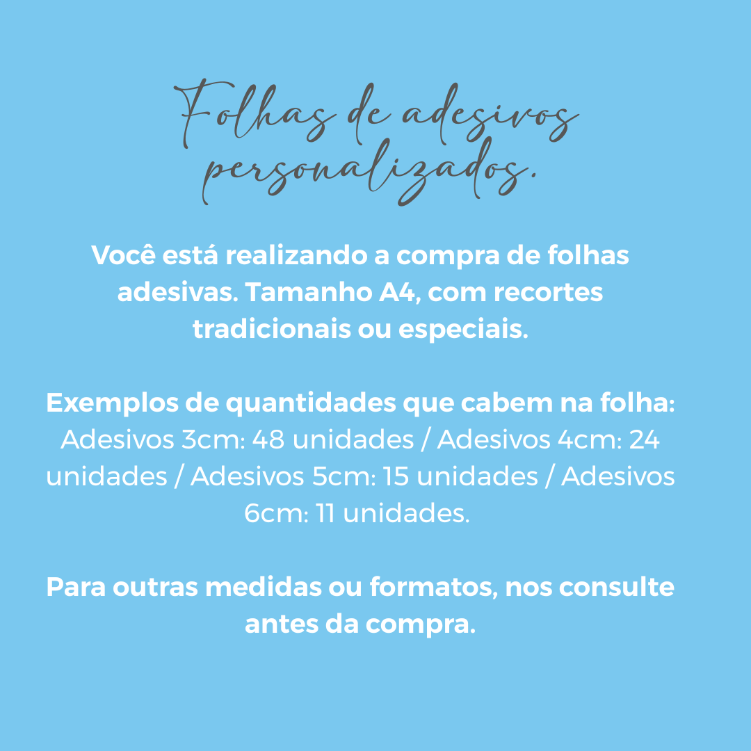 Exemplos de quantidades que cabem na folha: Adesivos 3cm: 48 unidades / Adesivos 4cm: 24 unidades / Adesivos 5cm: 15 unidades / Adesivos 6cm: 11 unidades.