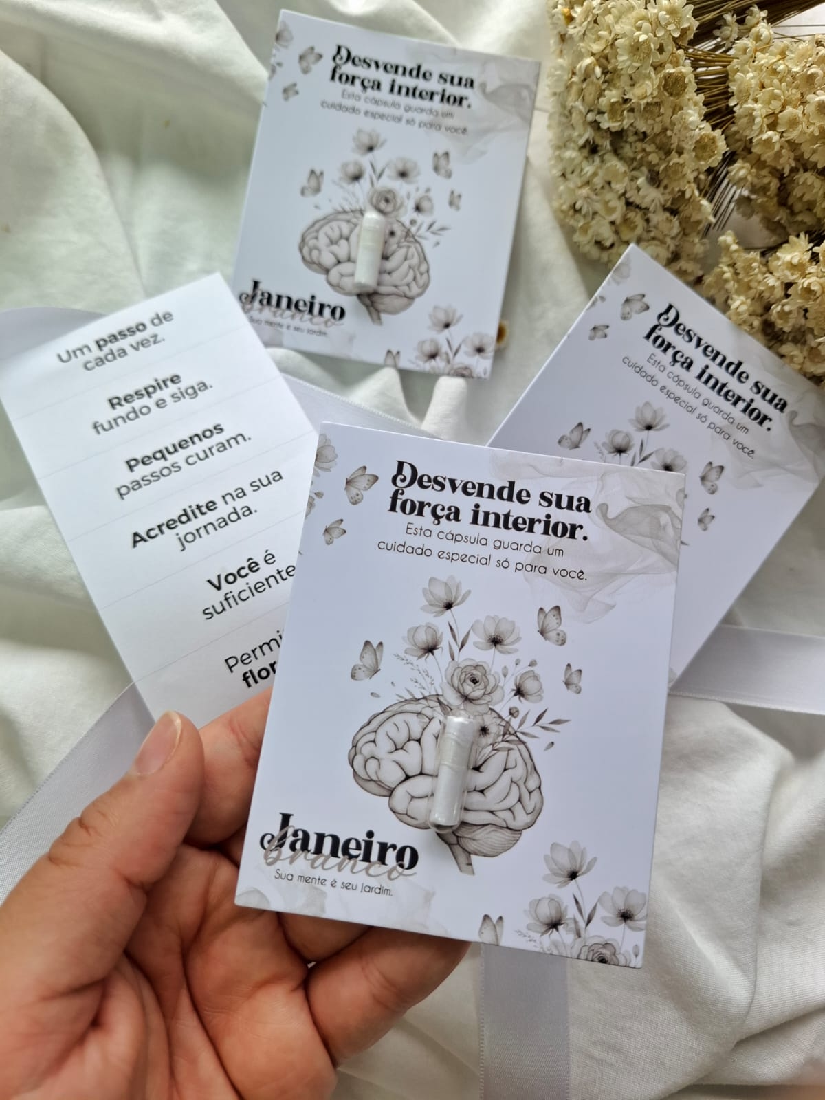 Tamanho do Card: 8x10cm + cápsulas com 10 frases motivacionais de apoio ao cuidado mental.